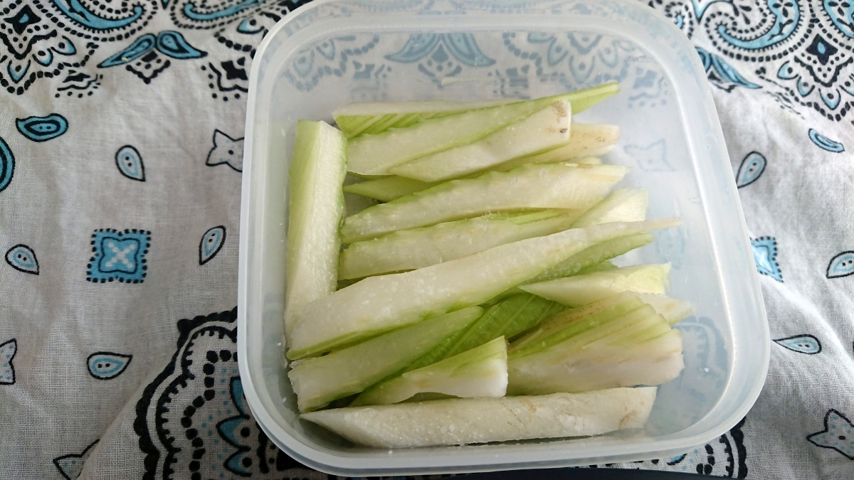 昨日のセルリーは1㎝幅に繊維を断つように切り、切れ口に当たるように塩を小1ふります。食べるときまで軽く塩漬け。